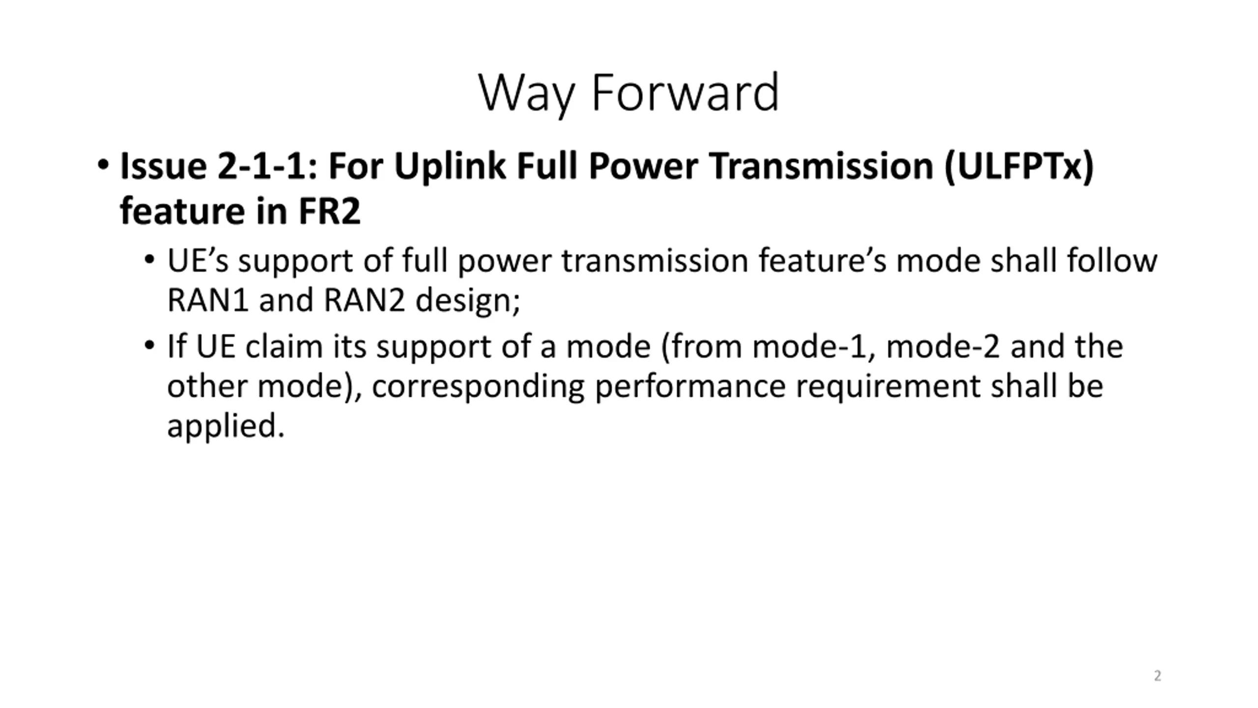 2. Way Forward • Issue 2-1-1: For Uplink Full Power Transmission (ULFPTx) feature in FR2 • UE’s support of full power transmission feature’s mode shall follow RAN1 and RAN2 design; • If UE claim its support of a mode (from mode-1, mode-2 and the other mode), corresponding performance requirement shall be applied. 2