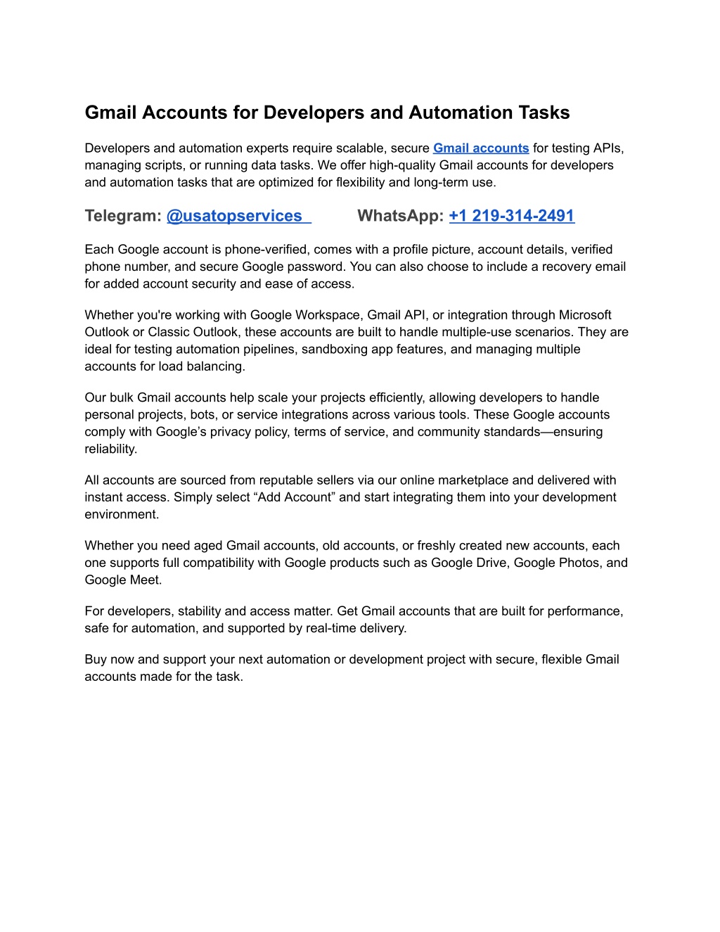 Gmail Accounts for Developers and Automation Tasks Developers and automation experts require scalable, secure Gmail accounts for testing APIs, managing scripts, or running data tasks. We offer high-quality Gmail accounts for developers and automation tasks that are optimized for flexibility and long-term use. Telegram: @usatopservices WhatsApp: +1 219-314-2491 Each Google account is phone-verified, comes with a profile picture, account details, verified phone number, and secure Google password. You can also choose to include a recovery email for added account security and ease of access. Whether you're working with Google Workspace, Gmail API, or integration through Microsoft Outlook or Classic Outlook, these accounts are built to handle multiple-use scenarios. They are ideal for testing automation pipelines, sandboxing app features, and managing multiple accounts for load balancing. Our bulk Gmail accounts help scale your projects efficiently, allowing developers to handle personal projects, bots, or service integrations across various tools. These Google accounts comply with Google’s privacy policy, terms of service, and community standards—ensuring reliability. All accounts are sourced from reputable sellers via our online marketplace and delivered with instant access. Simply select “Add Account” and start integrating them into your development environment. Whether you need aged Gmail accounts, old accounts, or freshly created new accounts, each one supports full compatibility with Google products such as Google Drive, Google Photos, and Google Meet. For developers, stability and access matter. Get Gmail accounts that are built for performance, safe for automation, and supported by real-time delivery. Buy now and support your next automation or development project with secure, flexible Gmail accounts made for the task.