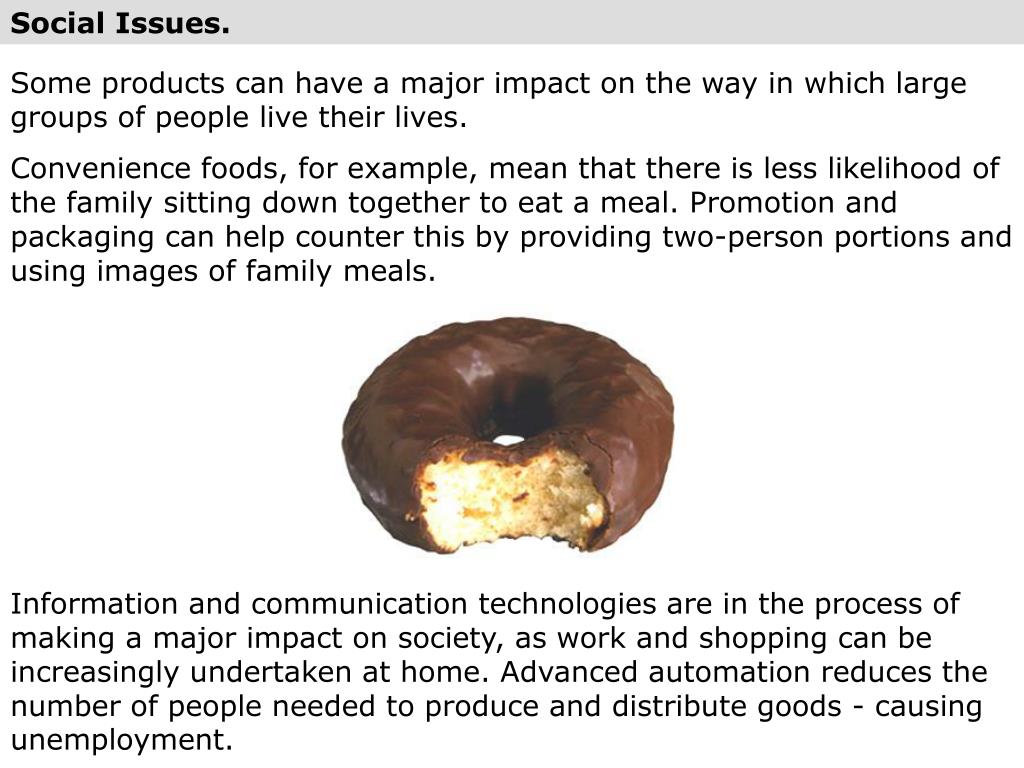 Social Issues. Some products can have amajor impact on the way in which large groups of people live their lives. Convenience foods, for example, mean that there is less likelihood of the family sitting down together to eat a meal. Promotion and packaging can help counter this by providing two-person portions and using images of family meals. Information and communication technologies are in the process of making a major impact on society, as work and shopping can be increasingly undertaken at home. Advanced automation reduces the number of people needed to produce and distribute goods - causing unemployment.