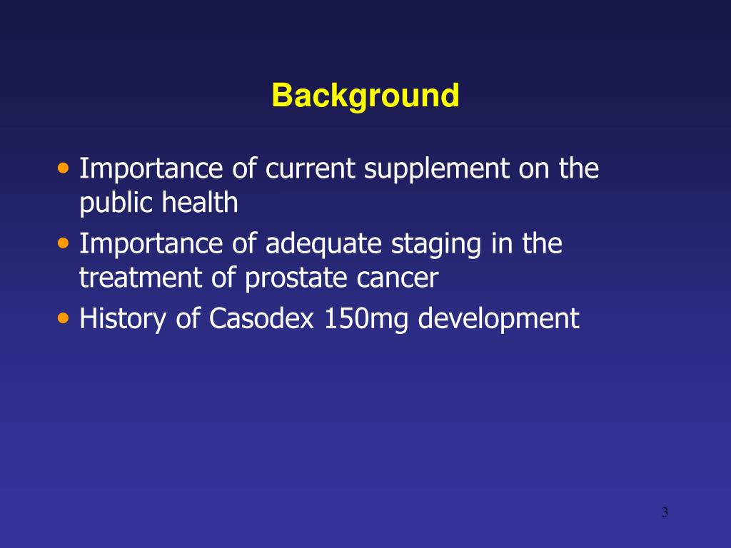 Background • Importance of current supplement on the public health • Importance of adequate staging in the treatment of prostate cancer • History of Casodex 150mg development