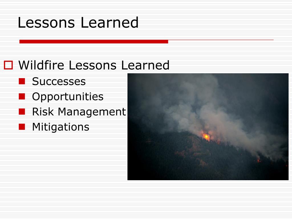 Lessons Learned Wildfire Lessons Learned Successes Opportunities Risk Management Mitigations