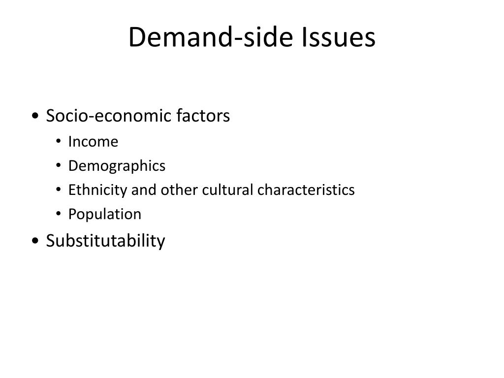 Demand-side Issues • Socio-economic factors • Income • Demographics • Ethnicity and other cultural characteristics • Population • Substitutability