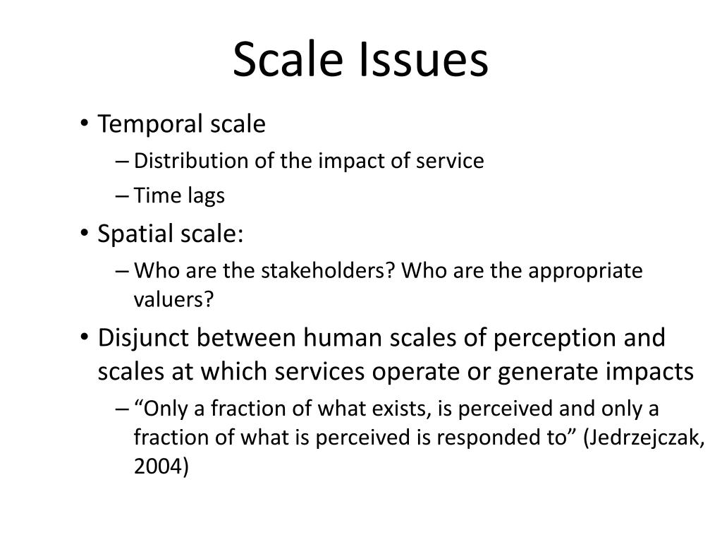 Scale Issues • Temporal scale • Distribution of the impact of service • Time lags • Spatial scale: • Who are the stakeholders? Who are the appropriate valuers? • Disjunct between human scales of perception and scales at which services operate or generate impacts • “Only a fraction of what exists, is perceived and only a fraction of what is perceived is responded to” (Jedrzejczak, 2004)