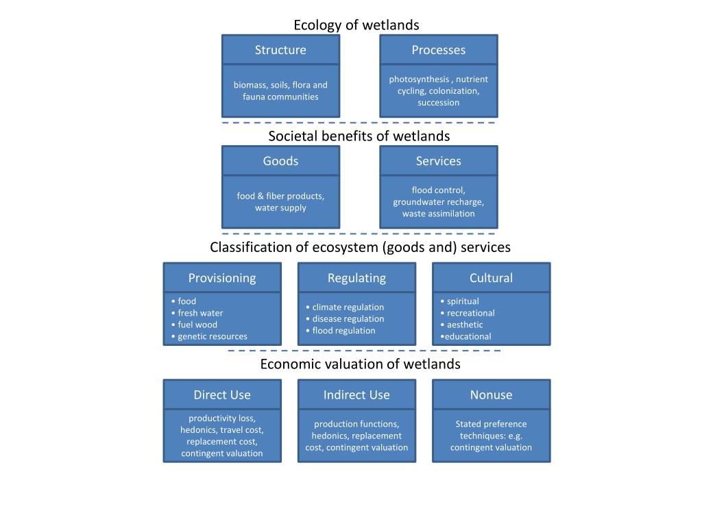Ecology of wetlands Prioritization of wetlands Structure Processes Goods Services Ecosystem Service Indicators Functional Indicators bio-physical equivalence socio-economic equivalence flood control, water purification food & fiber products, water supply photosynthesis, nutrient cycling, colonization biomass, soils, flora and fauna communities Societal benefits of wetlands Crediting and trading of wetlands Methods for valuing wetland services Markets Revealed Preferences Non-monetary Evaluation Stated Preferences