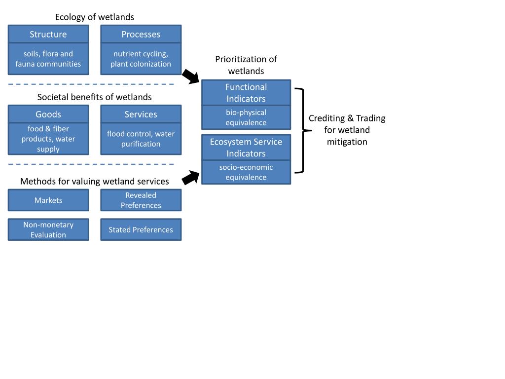 Ecology of wetlands Prioritization of wetlands Structure Processes Goods Services Ecosystem Service Indicators Functional Indicators flood control, water purification food & fiber products, water supply soils, flora and fauna communities nutrient cycling, plant colonization socio-economic equivalence bio-physical equivalence Societal benefits of wetlands Crediting & Trading for wetland mitigation Methods for valuing wetland services Markets Revealed Preferences Non-monetary Evaluation Stated Preferences