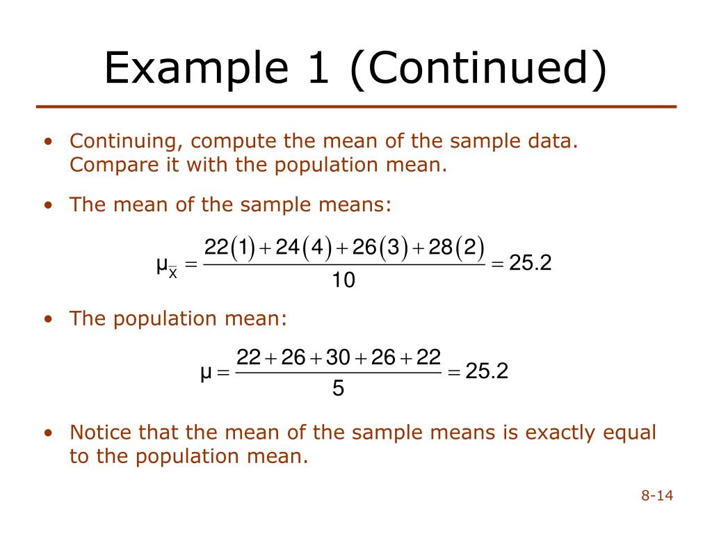 Example 1 (Continued) • Continuing, compute the mean of the sample data. Compare it with the population mean. • The mean of the sample means: • The population mean: • Notice that the mean of the sample means is exactly equal to the population mean.