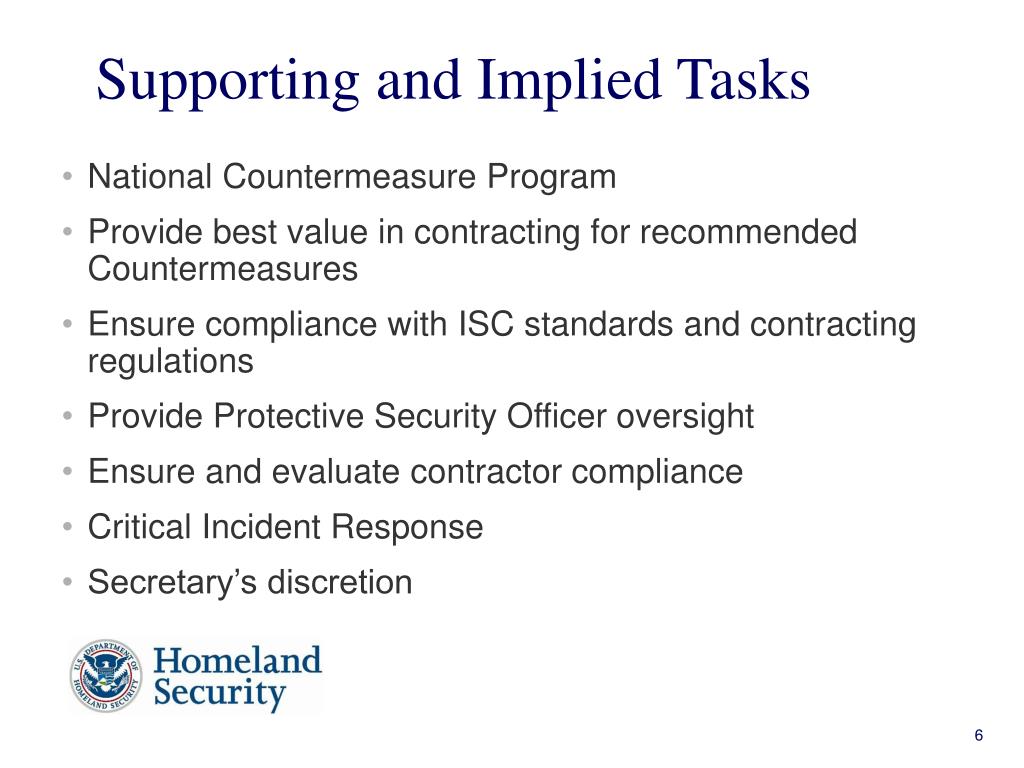 National Countermeasure Program Provide best value in contracting for recommended Countermeasures Ensure compliance with ISC standards and contracting regulations Provide Protective Security Officer oversight Ensure and evaluate contractor compliance Critical Incident Response Secretary’s discretion Supporting and Implied Tasks