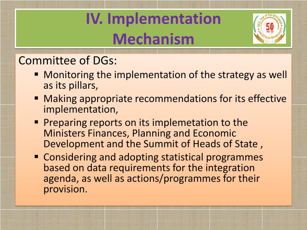 IV. ImplementationMechanism Committee of DGs: • Monitoring the implementation of the strategy as well as its pillars, • Making appropriate recommendations for its effective implementation, • Preparing reports on its implemetation to the Ministers Finances, Planning and Economic Development and the Summit of Heads of State , • Considering and adopting statistical programmes based on data requirements for the integration agenda, as well as actions/programmes for their provision.