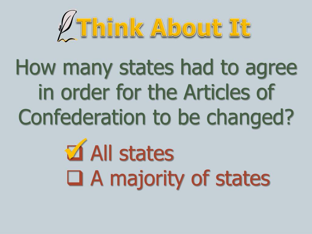 Think About It How many states had to agree in order for the Articles of Confederation to be changed? All states A majority of states