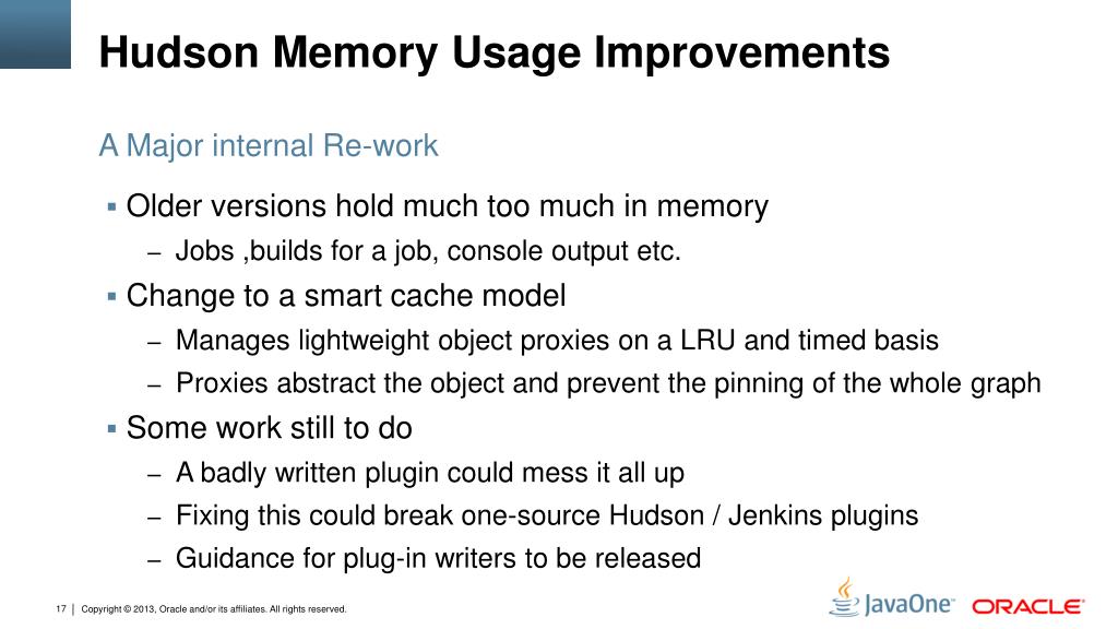 Hudson Memory Usage Improvements A Major internal Re-work • Older versions hold much too much in memory • Jobs ,builds for a job, console output etc. • Change to a smart cache model • Manages lightweight object proxies on a LRU and timed basis • Proxies abstract the object and prevent the pinning of the whole graph • Some work still to do • A badly written plugin could mess it all up • Fixing this could break one-source Hudson / Jenkins plugins • Guidance for plug-in writers to be released
