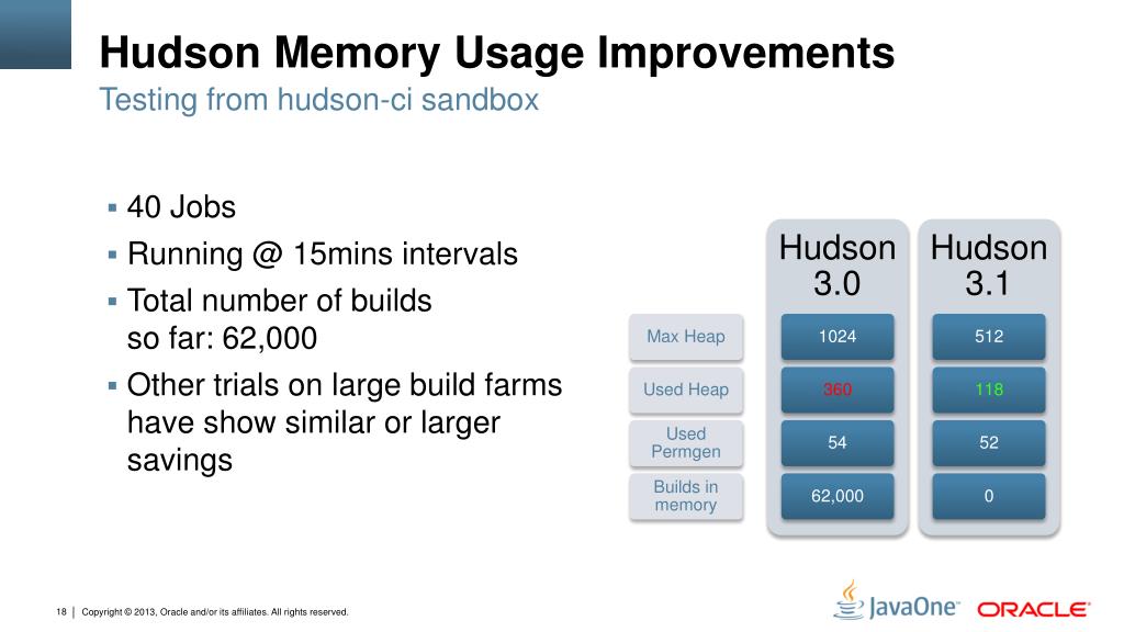 Hudson Memory Usage Improvements Testing from hudson-ci sandbox • 40 Jobs • Running @ 15mins intervals • Total number of builds so far: 62,000 • Other trials on large build farms have show similar or larger savings