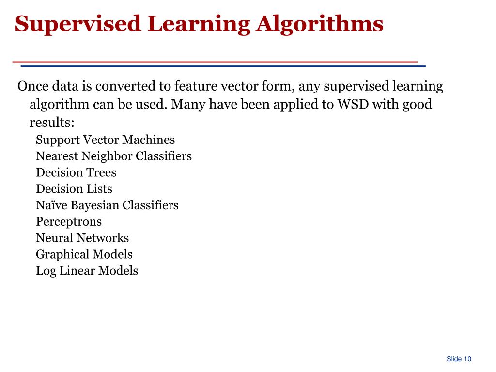 Supervised Learning Algorithms • Once data is converted to feature vector form, any supervised learning algorithm can be used. Many have been applied to WSD with good results: • Support Vector Machines • Nearest Neighbor Classifiers • Decision Trees • Decision Lists • Naïve Bayesian Classifiers • Perceptrons • Neural Networks • Graphical Models • Log Linear Models