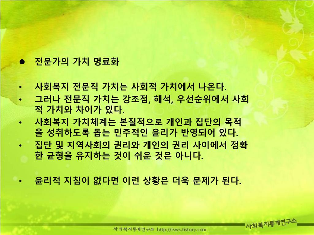 전문가의 가치 명료화 • 사회복지 전문직 가치는 사회적 가치에서 나온다. • 그러나 전문직 가치는 강조점, 해석, 우선순위에서 사회적 가치와 차이가 있다. • 사회복지 가치체계는 본질적으로 개인과 집단의 목적을 성취하도록 돕는 민주적인 윤리가 반영되어 있다. • 집단 및 지역사회의 권리와 개인의 권리 사이에서 정확한 균형을 유지하는 것이 쉬운 것은 아니다. • 윤리적 지침이 없다면 이런 상황은 더욱 문제가 된다.