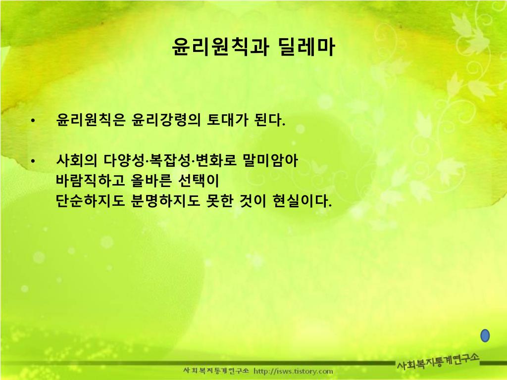 윤리원칙과 딜레마 • 윤리원칙은 윤리강령의 토대가 된다. • 사회의 다양성·복잡성·변화로 말미암아 바람직하고 올바른 선택이 단순하지도 분명하지도 못한 것이 현실이다.