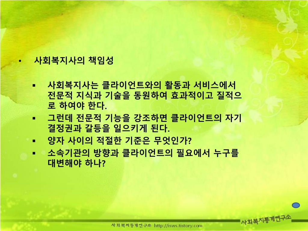 사회복지사의 책임성 • 사회복지사는 클라이언트와의 활동과 서비스에서 전문적 지식과 기술을 동원하여 효과적이고 질적으로 하여야 한다. • 그런데 전문적 기능을 강조하면 클라이언트의 자기결정권과 갈등을 일으키게 된다. • 양자 사이의 적절한 기준은 무엇인가? • 소속기관의 방향과 클라이언트의 필요에서 누구를 대변해야 하나?