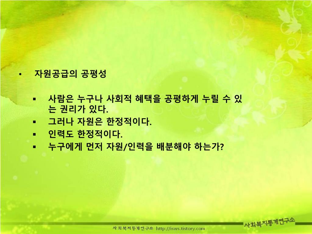 자원공급의 공평성 • 사람은 누구나 사회적 혜택을 공평하게 누릴 수 있는 권리가 있다. • 그러나 자원은 한정적이다. • 인력도 한정적이다. • 누구에게 먼저 자원/인력을 배분해야 하는가?