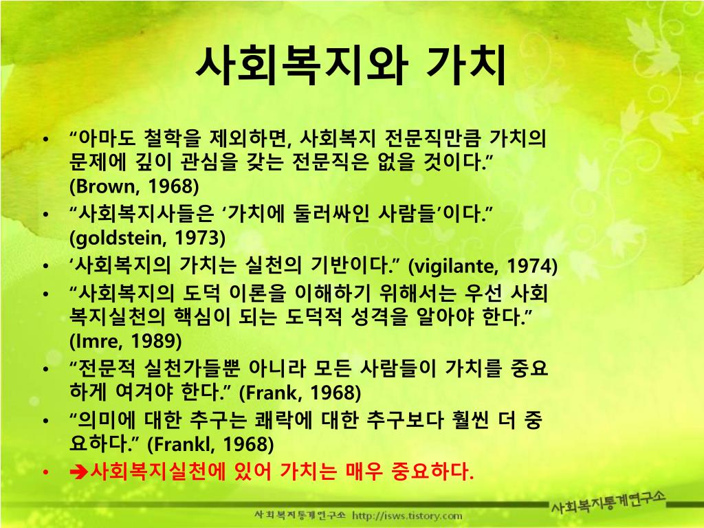 사회복지와 가치 • “아마도 철학을 제외하면, 사회복지 전문직만큼 가치의 문제에 깊이 관심을 갖는 전문직은 없을 것이다.” (Brown, 1968) • “사회복지사들은‘가치에 둘러싸인 사람들’이다.” (goldstein, 1973) • ‘사회복지의 가치는 실천의 기반이다.” (vigilante, 1974) • “사회복지의 도덕 이론을 이해하기 위해서는 우선 사회복지실천의 핵심이 되는 도덕적 성격을 알아야 한다.” (Imre, 1989) • “전문적 실천가들뿐 아니라 모든 사람들이 가치를 중요하게 여겨야 한다.” (Frank, 1968) • “의미에대한 추구는 쾌락에 대한 추구보다 훨씬 더 중요하다.” (Frankl, 1968) • 사회복지실천에 있어 가치는 매우 중요하다.