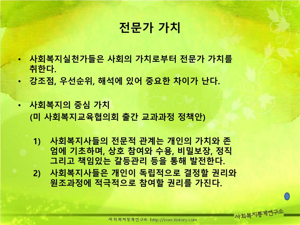 전문가 가치 • 사회복지실천가들은 사회의 가치로부터 전문가 가치를 취한다. • 강조점, 우선순위, 해석에 있어 중요한 차이가 난다. • 사회복지의 중심 가치 (미 사회복지교육협의회 출간교과과정 정책안) • 사회복지사들의 전문적 관계는 개인의 가치와 존엄에 기초하며, 상호 참여와 수용, 비밀보장, 정직 그리고 책임있는 갈등관리 등을 통해 발전한다. • 사회복지사들은 개인이 독립적으로 결정할 권리와 원조과정에 적극적으로 참여할 권리를 가진다.