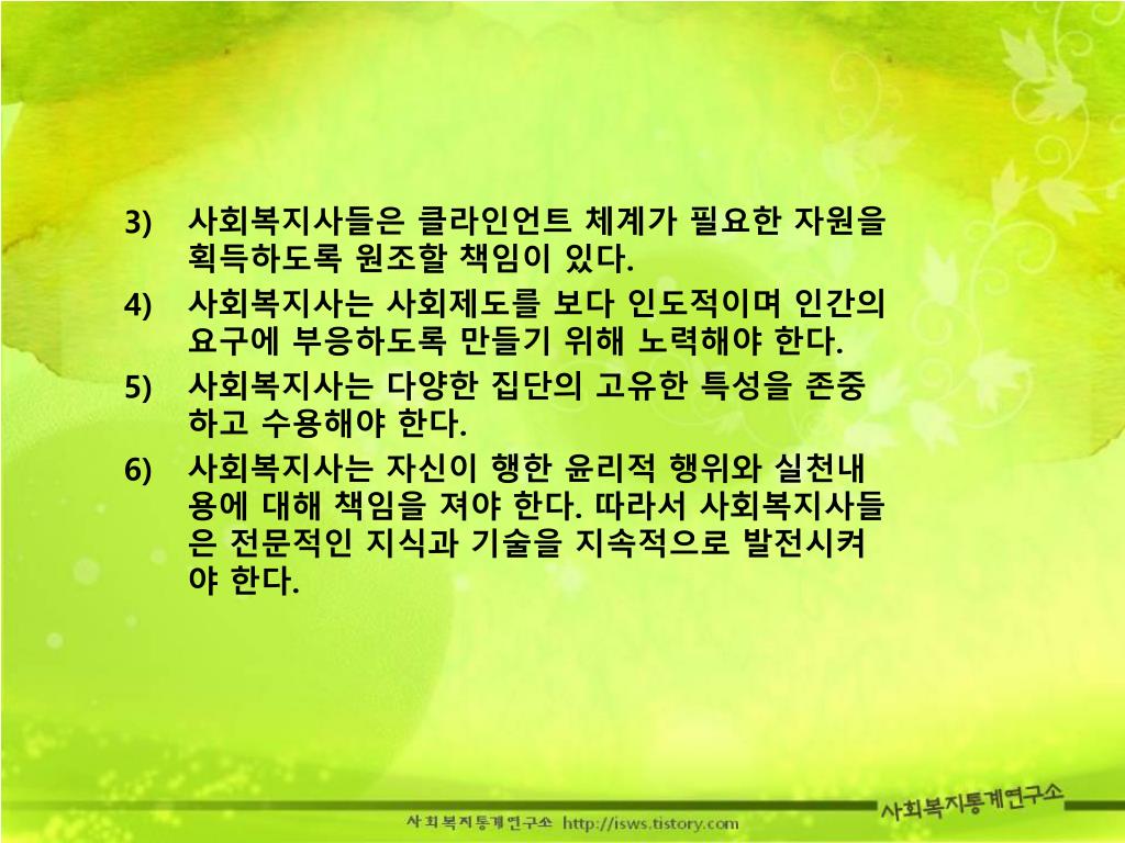 사회복지사들은클라인언트 체계가 필요한 자원을 획득하도록 원조할 책임이 있다. • 사회복지사는 사회제도를 보다 인도적이며 인간의 요구에 부응하도록 만들기 위해 노력해야 한다. • 사회복지사는 다양한 집단의 고유한 특성을 존중하고 수용해야 한다. • 사회복지사는 자신이 행한 윤리적 행위와 실천내용에 대해 책임을 져야 한다. 따라서 사회복지사들은 전문적인 지식과 기술을 지속적으로 발전시켜야 한다.