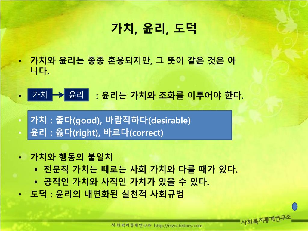 가치, 윤리, 도덕 • 가치와 윤리는 종종 혼용되지만, 그 뜻이 같은 것은 아니다. • : 윤리는 가치와 조화를 이루어야 한다. • 가치 : 좋다(good), 바람직하다(desirable) • 윤리 : 옳다(right), 바르다(correct) • 가치와 행동의 불일치 • 전문직 가치는 때로는 사회 가치와 다를 때가 있다. • 공적인 가치와 사적인 가치가 있을 수 있다. • 도덕 : 윤리의 내면화된 실천적 사회규범 가치 윤리