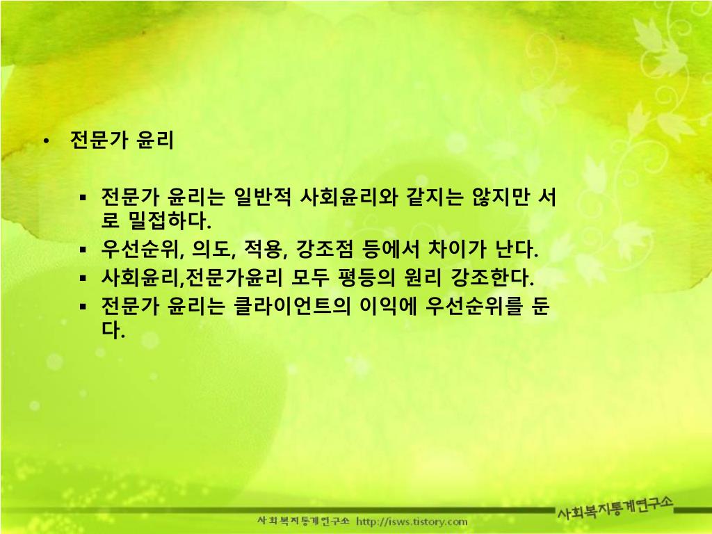 전문가 윤리 • 전문가 윤리는 일반적 사회윤리와 같지는 않지만 서로 밀접하다. • 우선순위, 의도, 적용, 강조점 등에서 차이가 난다. • 사회윤리,전문가윤리 모두 평등의 원리 강조한다. • 전문가 윤리는 클라이언트의 이익에 우선순위를 둔다.