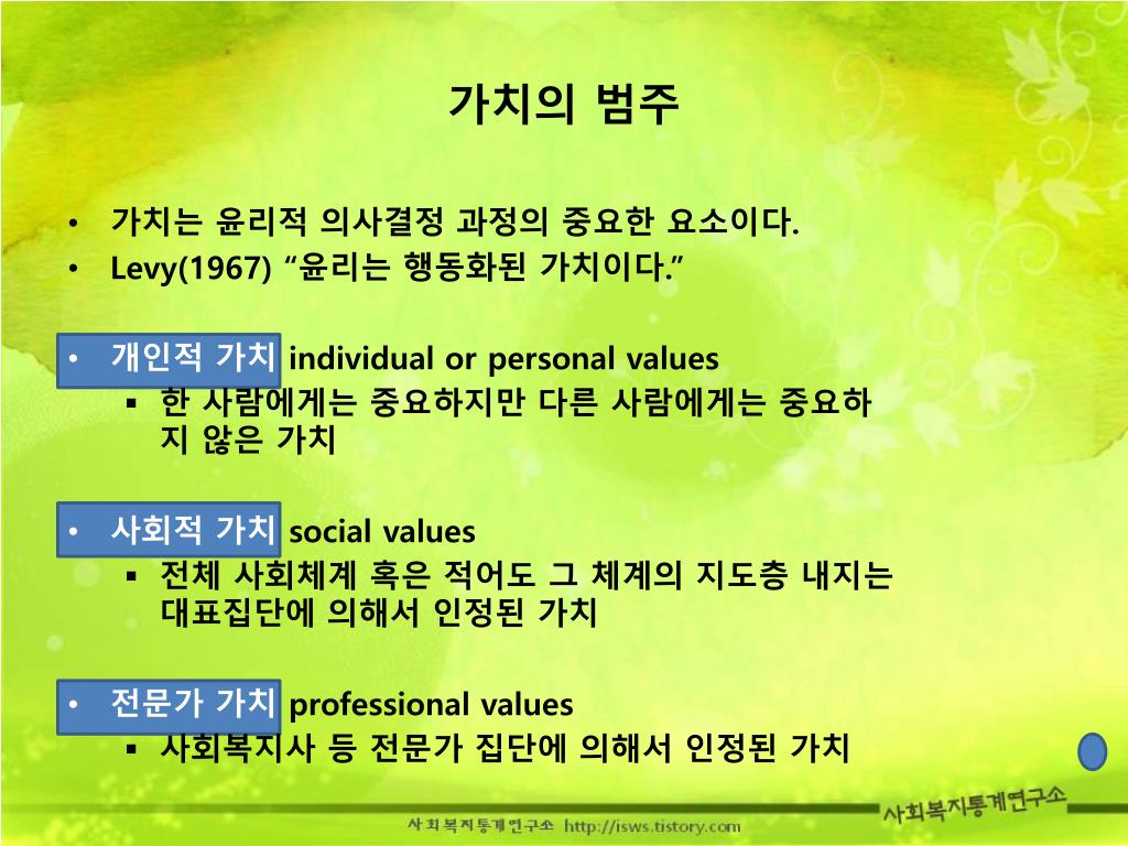 가치의 범주 • 가치는 윤리적 의사결정 과정의 중요한 요소이다. • Levy(1967) “윤리는 행동화된 가치이다.” • 개인적 가치 individual or personal values • 한 사람에게는 중요하지만 다른 사람에게는 중요하지 않은 가치 • 사회적 가치 social values • 전체 사회체계 혹은 적어도 그 체계의 지도층 내지는 대표집단에 의해서 인정된 가치 • 전문가 가치 professional values • 사회복지사 등 전문가 집단에 의해서 인정된 가치
