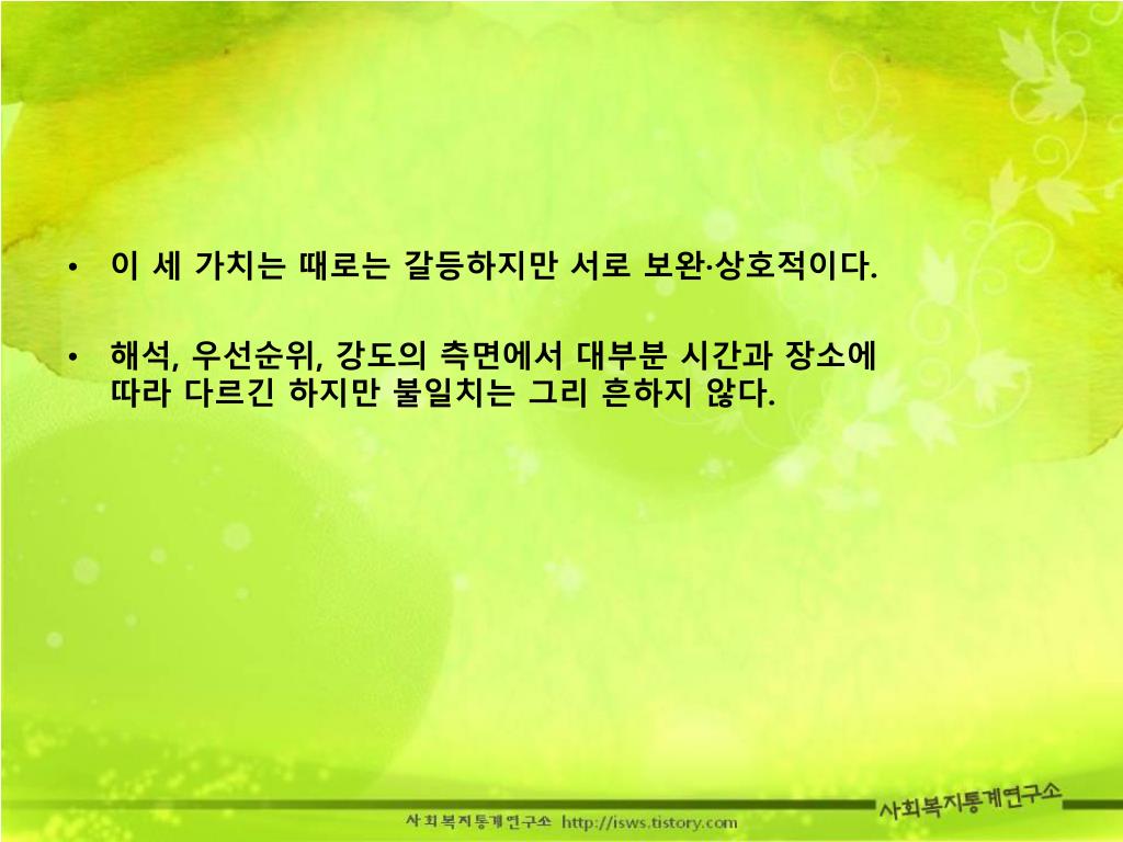 이 세 가치는 때로는 갈등하지만 서로 보완·상호적이다. • 해석, 우선순위, 강도의 측면에서 대부분 시간과 장소에 따라 다르긴 하지만 불일치는 그리 흔하지 않다.