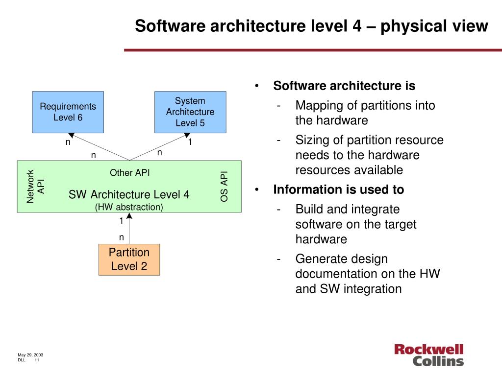 Software architecture level 4 – physical view • Software architecture is • Mapping of partitions into the hardware • Sizing of partition resource needs to the hardware resources available • Information is used to • Build and integrate software on the target hardware • Generate design documentation on the HW and SW integration