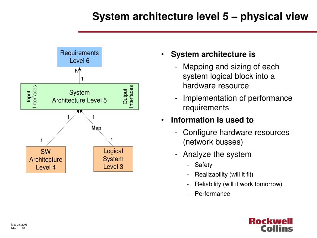 System architecture level 5 – physical view • System architecture is • Mapping and sizing of each system logical block into a hardware resource • Implementation of performance requirements • Information is used to • Configure hardware resources (network busses) • Analyze the system • Safety • Realizability (will it fit) • Reliability (will it work tomorrow) • Performance