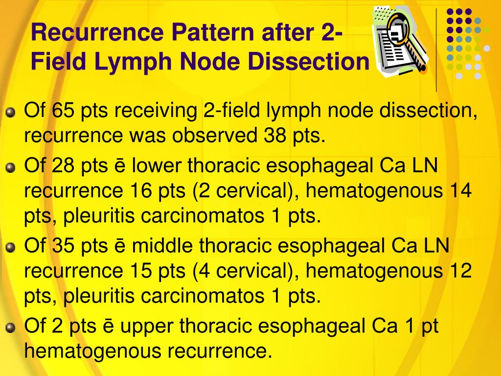 Recurrence Pattern after 2-Field Lymph Node Dissection • Of 65 pts receiving 2-field lymph node dissection, recurrence was observed 38 pts. • Of 28 pts ē lower thoracic esophageal Ca LN recurrence 16 pts (2 cervical), hematogenous 14 pts, pleuritis carcinomatos 1 pts. • Of 35 pts ē middle thoracic esophageal Ca LN recurrence 15 pts (4 cervical), hematogenous 12 pts, pleuritis carcinomatos 1 pts. • Of 2 pts ē upper thoracic esophageal Ca 1 pt hematogenous recurrence.