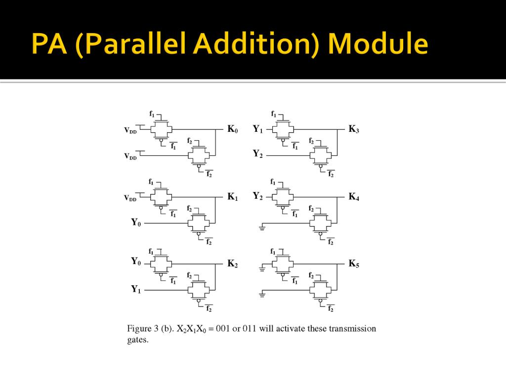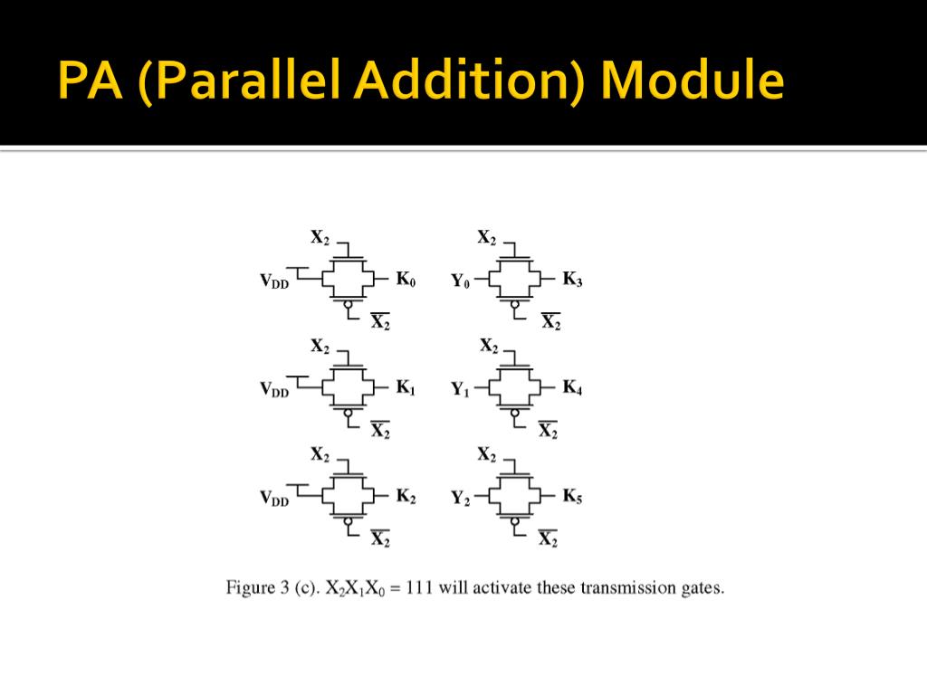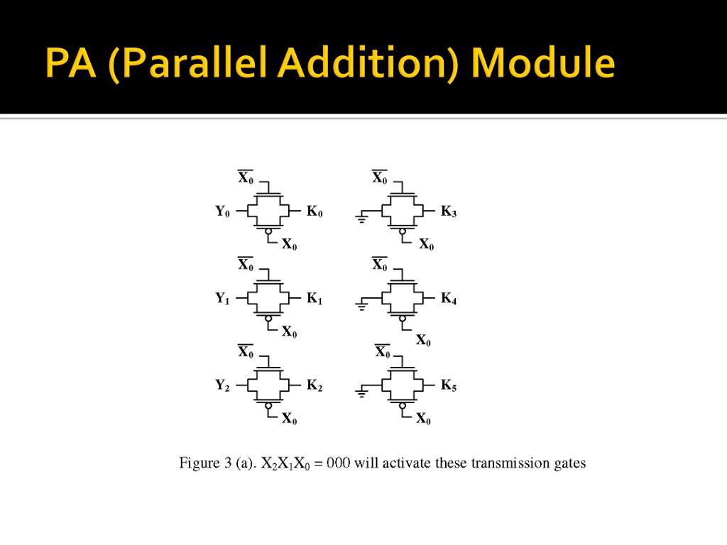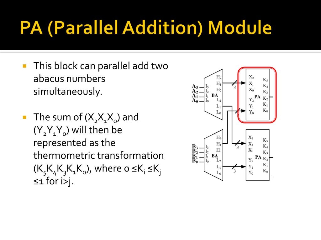 PA (Parallel Addition) Module • This block can parallel add two abacus numbers simultaneously. • The sum of (X2X1X0) and (Y2Y1Y0) will then be represented as the thermometric transformation (K5K4K3K1K0), where 0 ≤Ki ≤Kj ≤1 for i>j.