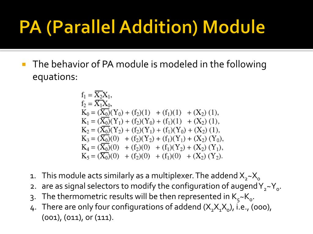 PA (Parallel Addition) Module • The behavior of PA module is modeled in the following equations: This module acts similarly as a multiplexer. The addend X2~X0 are as signal selectors to modify the configuration of augend Y2~Y0. The thermometric results will be then represented in K5~K0. There are only four configurations of addend (X2X1X0), i.e., (000), (001), (011), or (111).