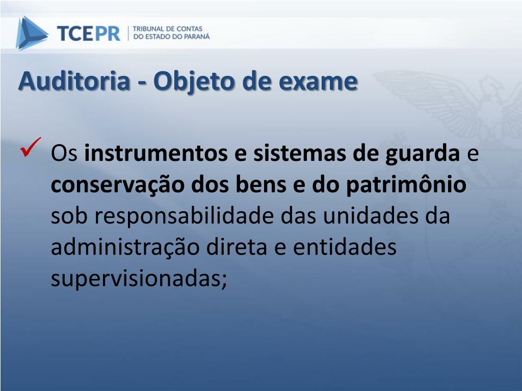 Auditoria - Objeto de exame Os instrumentos e sistemas de guarda e conservação dos bens e do patrimônio sob responsabilidade das unidades da administração direta e entidades supervisionadas;