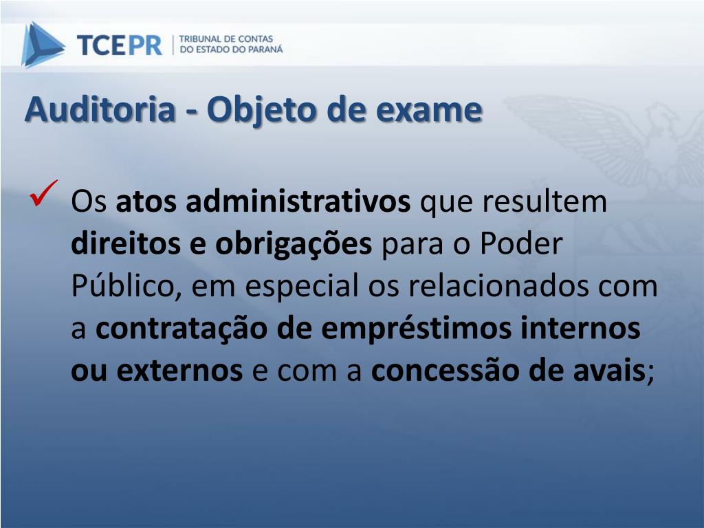 Auditoria - Objeto de exame • Os atos administrativos que resultem direitos e obrigações para o Poder Público, em especial os relacionados com a contratação de empréstimos internos ou externos e com a concessão de avais;