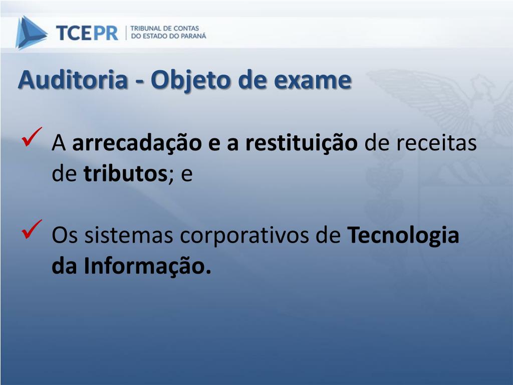 Auditoria - Objeto de exame • A arrecadação e a restituição de receitas de tributos; e • Os sistemas corporativos de Tecnologia da Informação.