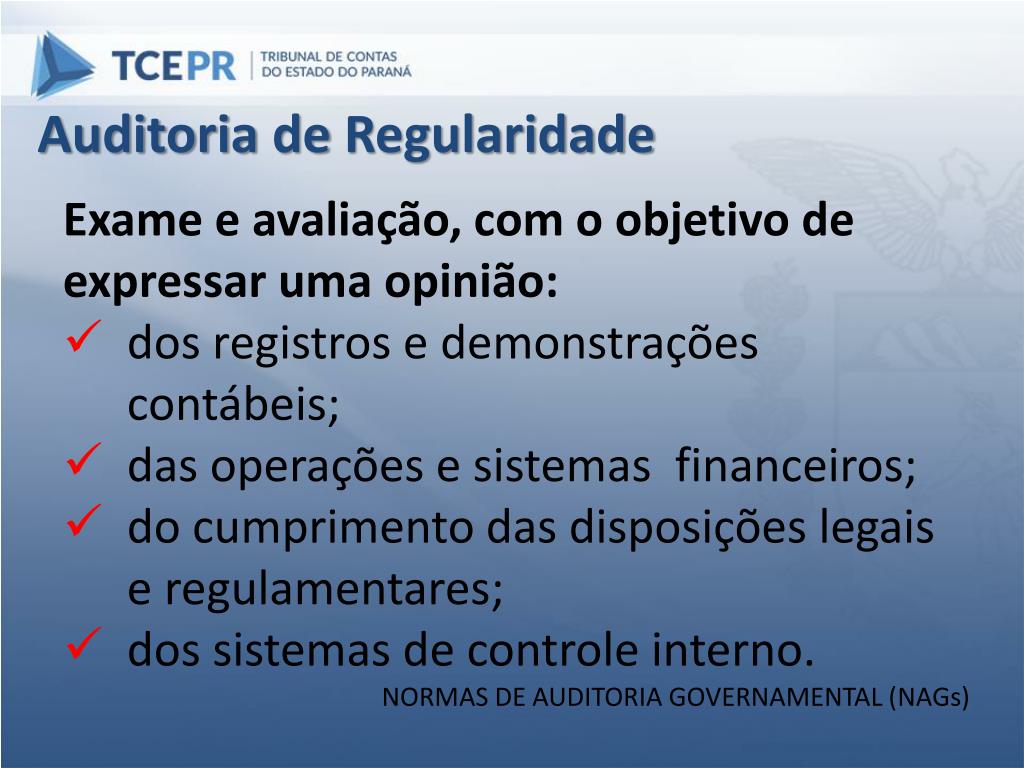 Auditoria de Regularidade • Exame e avaliação, com o objetivo de expressar uma opinião: • dos registros e demonstrações contábeis; • das operações e sistemas financeiros; • do cumprimento das disposições legais e regulamentares; • dos sistemas de controle interno. • NORMAS DE AUDITORIA GOVERNAMENTAL (NAGs)