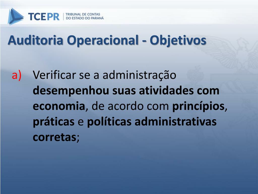 Auditoria Operacional - Objetivos Verificar se a administração desempenhou suas atividades com economia, de acordo com princípios, práticas e políticasadministrativascorretas;