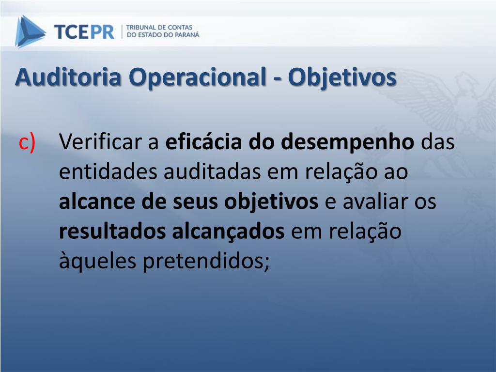 Auditoria Operacional - Objetivos Verificar a eficácia do desempenho das entidades auditadas em relação ao alcance de seus objetivos e avaliar os resultados alcançados em relação àqueles pretendidos;