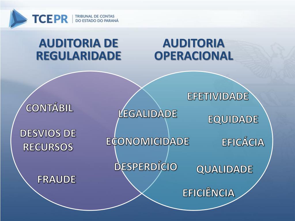 AUDITORIA DE REGULARIDADE AUDITORIA OPERACIONAL EFETIVIDADE CONTÁBIL LEGALIDADE EQUIDADE DESVIOS DE RECURSOS ECONOMICIDADE EFICÁCIA DESPERDÍCIO QUALIDADE FRAUDE EFICIÊNCIA