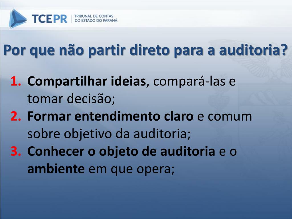Por que não partir direto para a auditoria? • Compartilhar ideias, compará-las e tomar decisão; • Formar entendimento claro e comum sobre objetivo da auditoria; • Conhecer o objeto de auditoria e o ambiente em que opera;