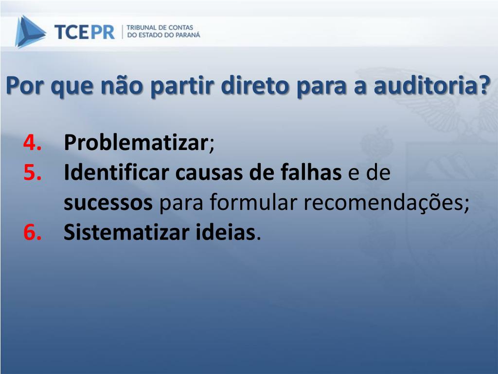 Por que não partir direto para a auditoria? Problematizar; Identificar causas de falhas e de sucessos para formular recomendações; Sistematizar ideias.