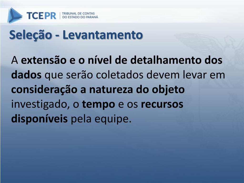 Seleção - Levantamento A extensão e o nível de detalhamento dos dados que serão coletados devem levar em consideração anatureza do objeto investigado, o tempo e os recursosdisponíveis pela equipe.