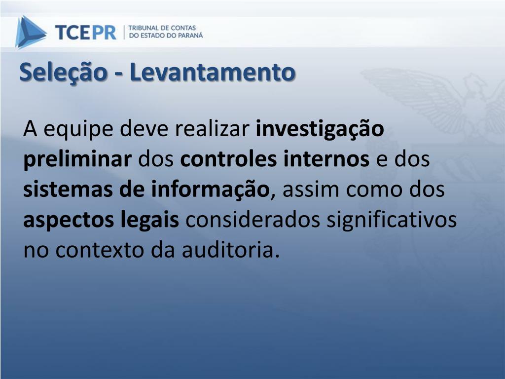 Seleção - Levantamento A equipe deve realizar investigação preliminar dos controles internos e dos sistemas de informação, assim como dos aspectos legais considerados significativos no contexto da auditoria.