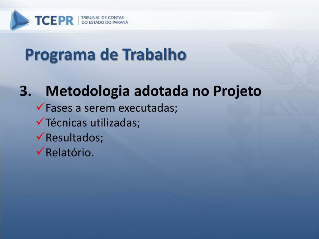 Programa de Trabalho • Metodologia adotada no Projeto • Fases a serem executadas; • Técnicas utilizadas; • Resultados; • Relatório.
