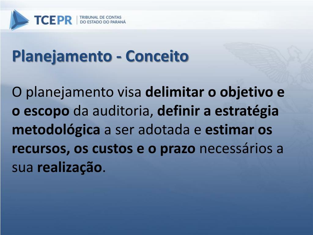 Planejamento - Conceito O planejamento visa delimitar o objetivo e o escopo da auditoria, definir a estratégia metodológica a ser adotada e estimar os recursos, os custos e o prazo necessários a sua realização.