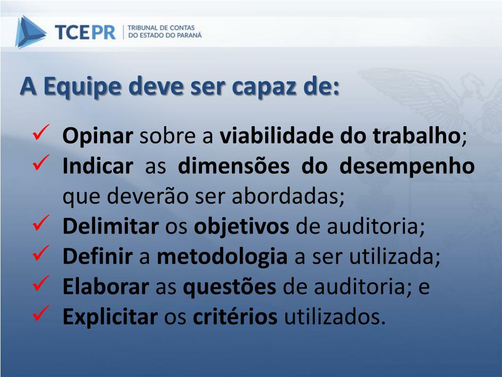 A Equipe deve ser capaz de: • Opinar sobre a viabilidade do trabalho; • Indicar as dimensões do desempenho que deverão ser abordadas; • Delimitar os objetivos de auditoria; • Definir a metodologia a ser utilizada; • Elaborar as questõesde auditoria; e • Explicitar os critériosutilizados.
