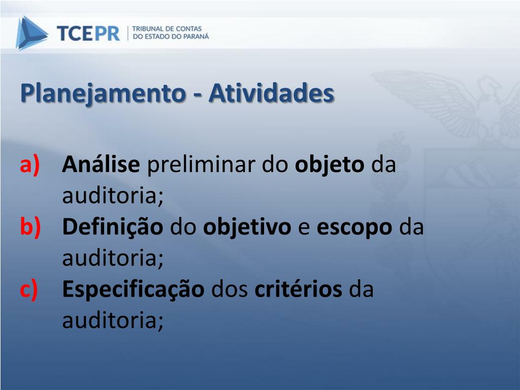 Planejamento - Atividades Análise preliminar do objetoda auditoria; Definição do objetivo e escopo da auditoria; Especificação dos critériosda auditoria;