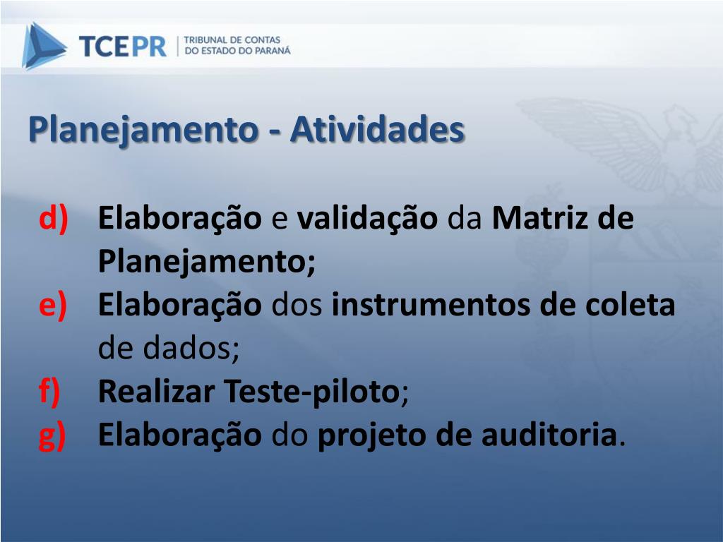 Planejamento - Atividades Elaboração e validação da Matriz de Planejamento; Elaboração dos instrumentos de coleta de dados; RealizarTeste-piloto; Elaboração do projetode auditoria.