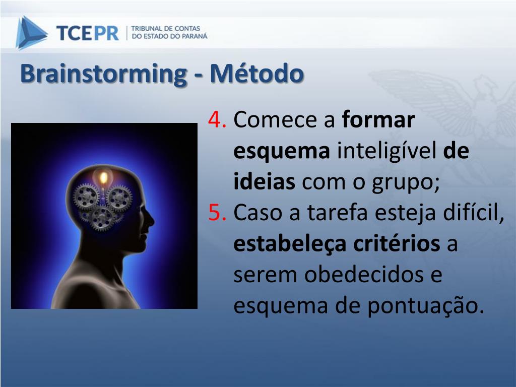 Brainstorming - Método • Comece a formaresquema inteligível de ideiascom o grupo; • Caso a tarefa esteja difícil, estabeleça critérios a serem obedecidos e esquema de pontuação.