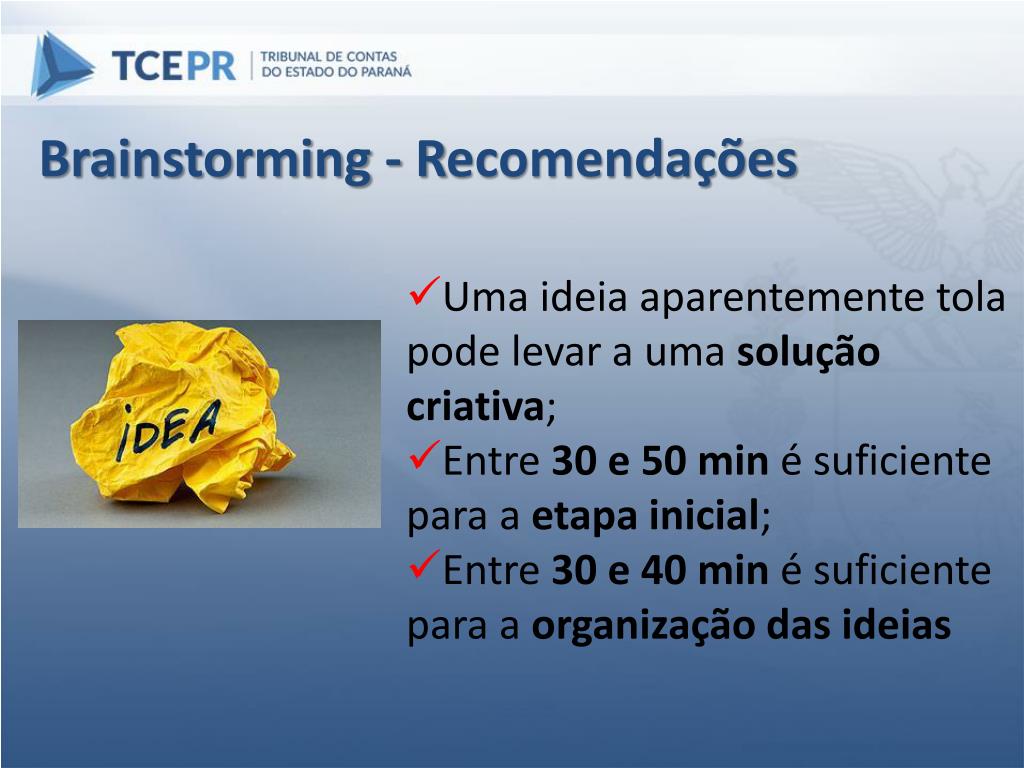 Brainstorming - Recomendações • Uma ideia aparentemente tola pode levar a uma soluçãocriativa; • Entre 30 e 50 min é suficiente para a etapa inicial; • Entre 30 e 40 min é suficiente para a organização das ideias